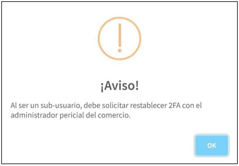Por favor diríjase al usuario principal o a quien tenga acceso a la cuenta principal para que le restablezcan el 2FA.