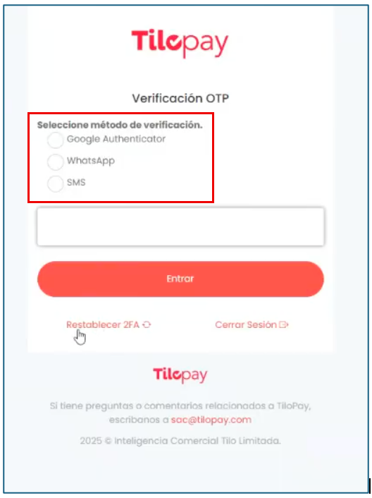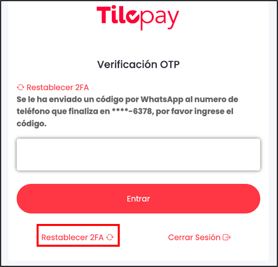 Oración: Esta guía detalla cómo cambiar o restablecer el método de autenticación en dos factores (2FA) en su cuenta de Tilopay. Se incluye para restablecer el 2FA desde el inicio de sesión cuando no se tiene acceso al código