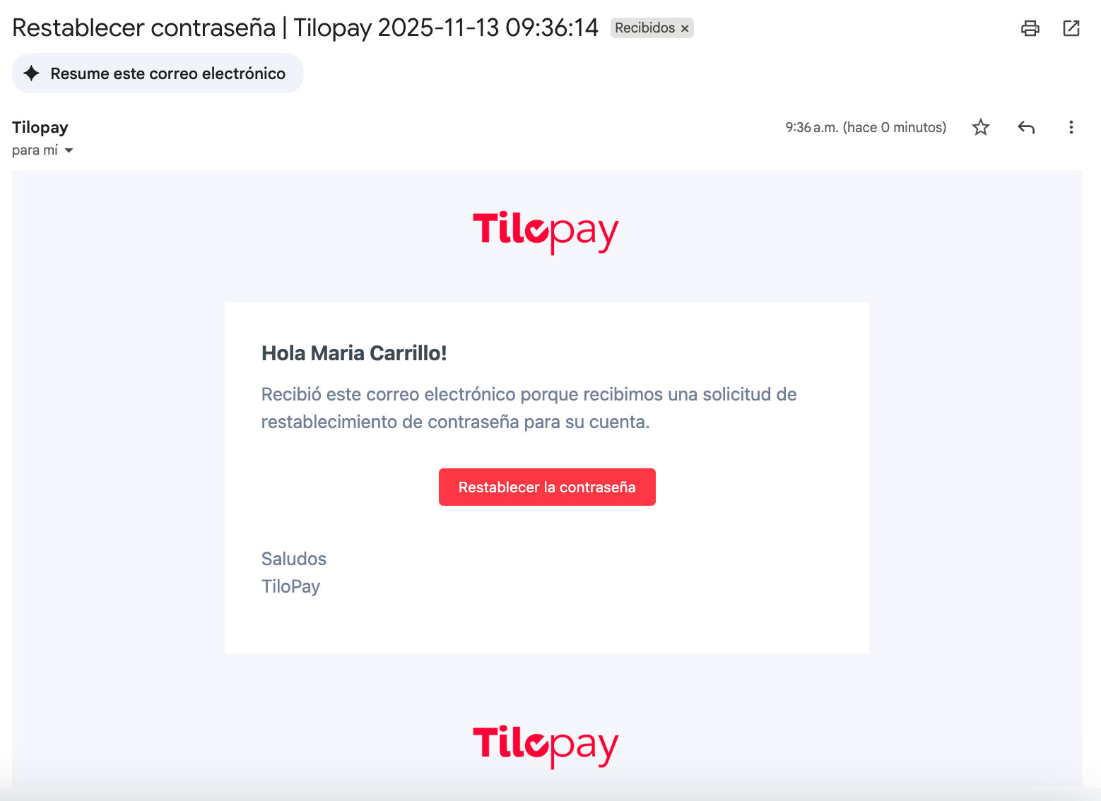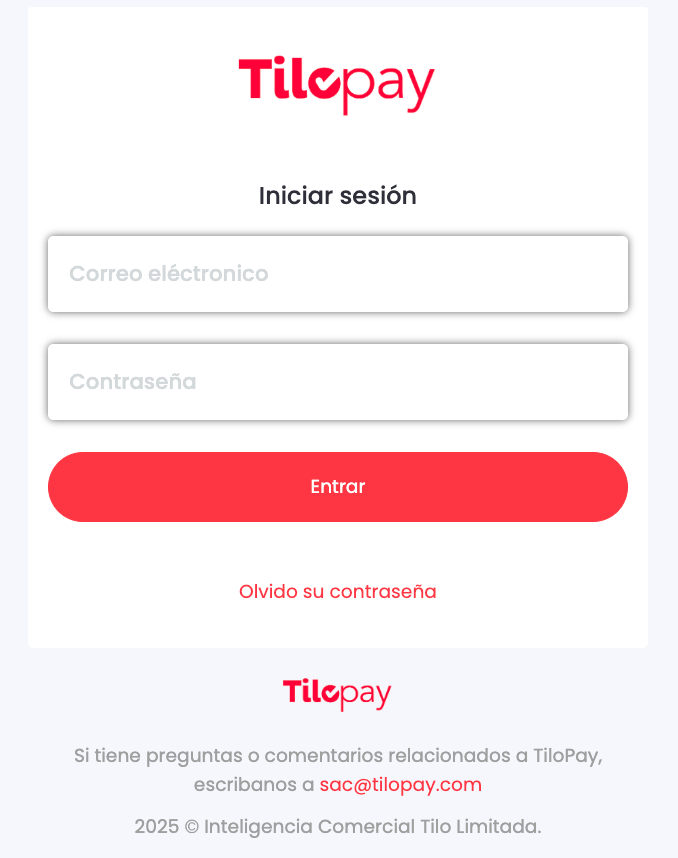 Oración: Si necesita restablecer su contraseña en la plataforma de Tilopay, siga los pasos indicados para garantizar un acceso seguro y continuar utilizando la plataforma. Es obligatorio configurar la autenticación en dos pasos para mantener la seguridad de su cuenta.