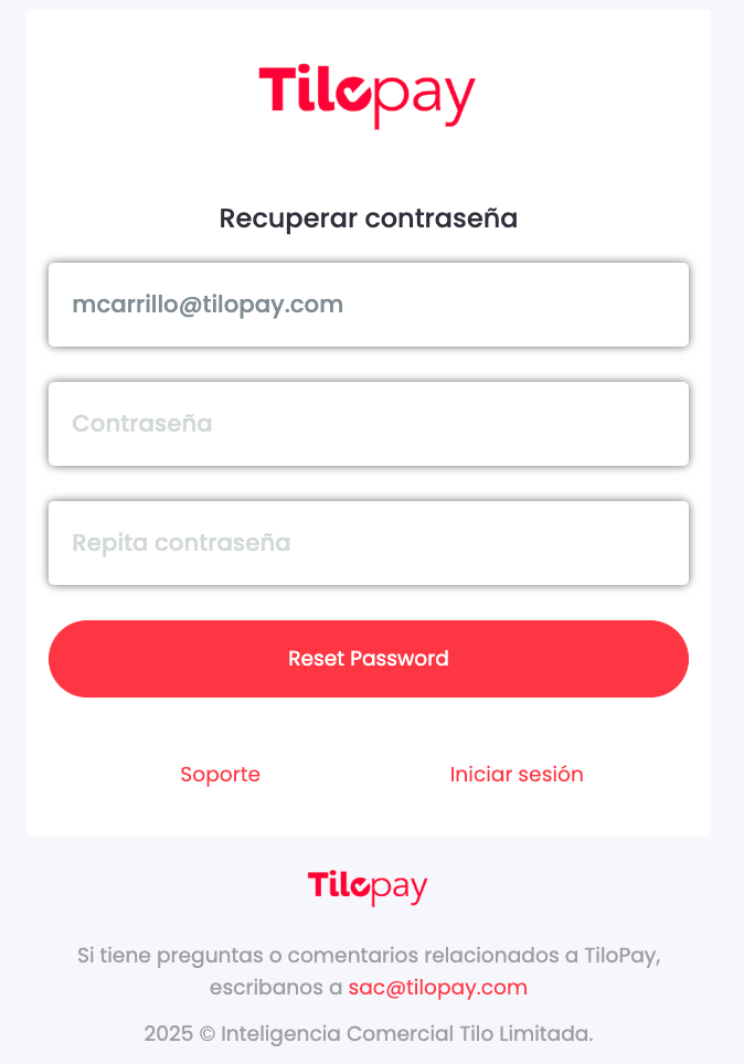 Pregunta: ¿Cómo puedo cambiar mi contraseña de Tilopay?, ¿Qué pasos debo seguir para restablecer mi contraseña?, ¿Cómo recupero el acceso a mi cuenta si olvidé mi contraseña?, ¿Cuál es el procedimiento para actualizar mi contraseña en el portal de Tilopay?, ¿Cómo restablezco mi contraseña de manera segura en Tilopay?