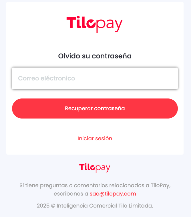 Le llevará a otra pantalla en la que debe ingresar el correo electrónico de usuario Tilopay, y dar clic en Recuperar contraseña.