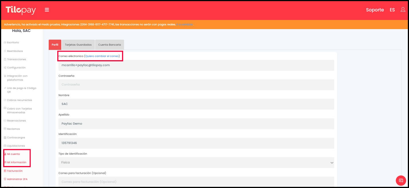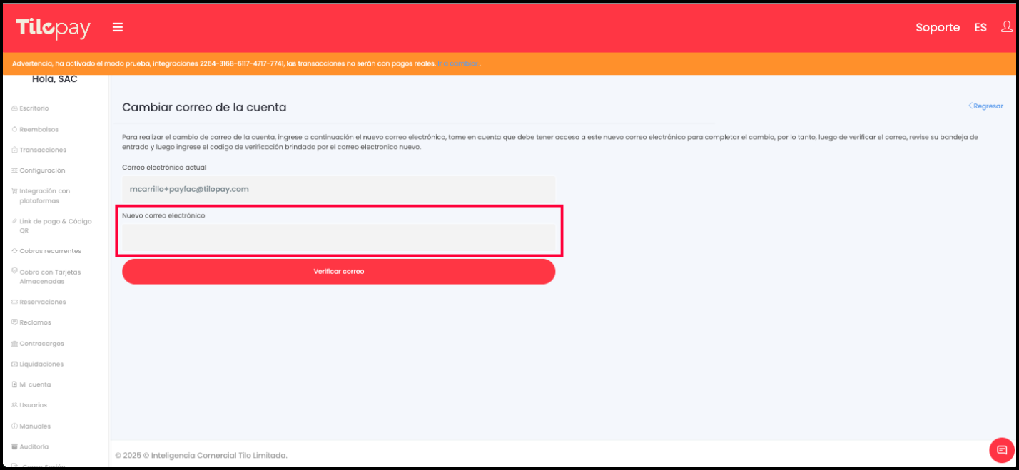 Para cambiar su correo en Tilopay, siga estos pasos:
