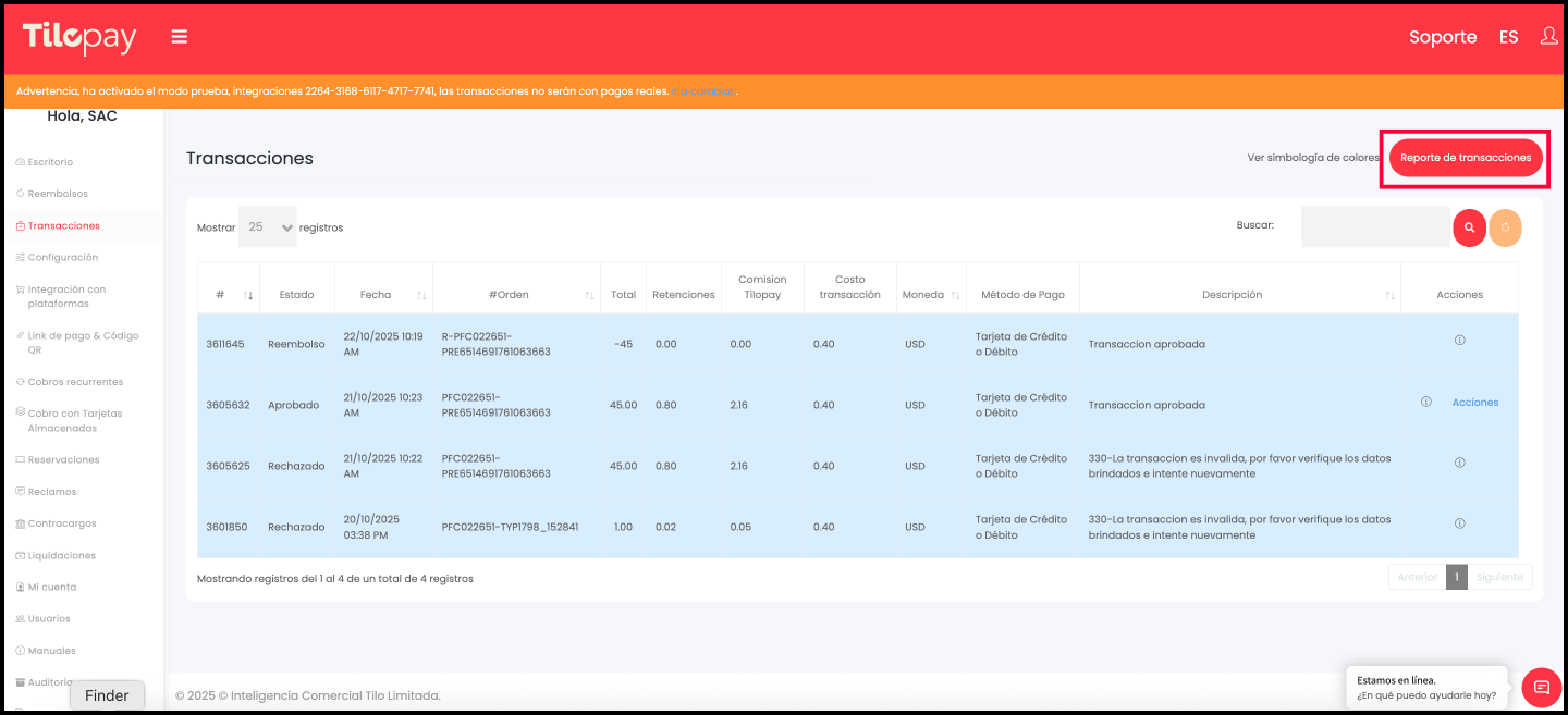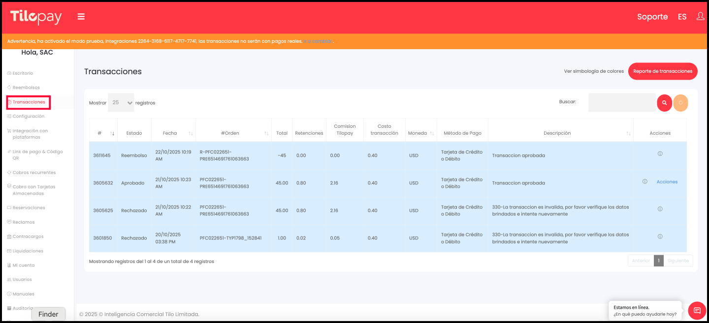 El módulo de Transacciones es el centro de control fundamental dentro de su panel de Tilopay. Permite a los usuarios monitorear en tiempo real el flujo de pagos, verificar el estado de cada operación y localizar rápidamente cualquier movimiento ...