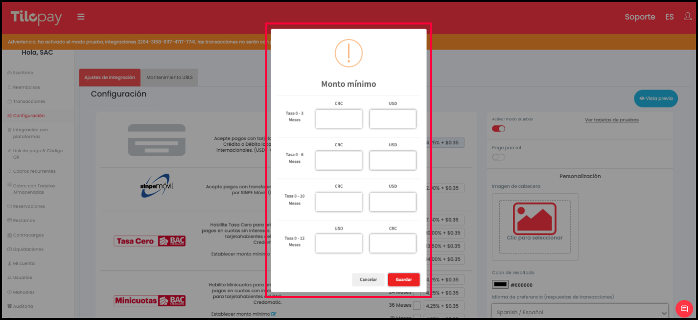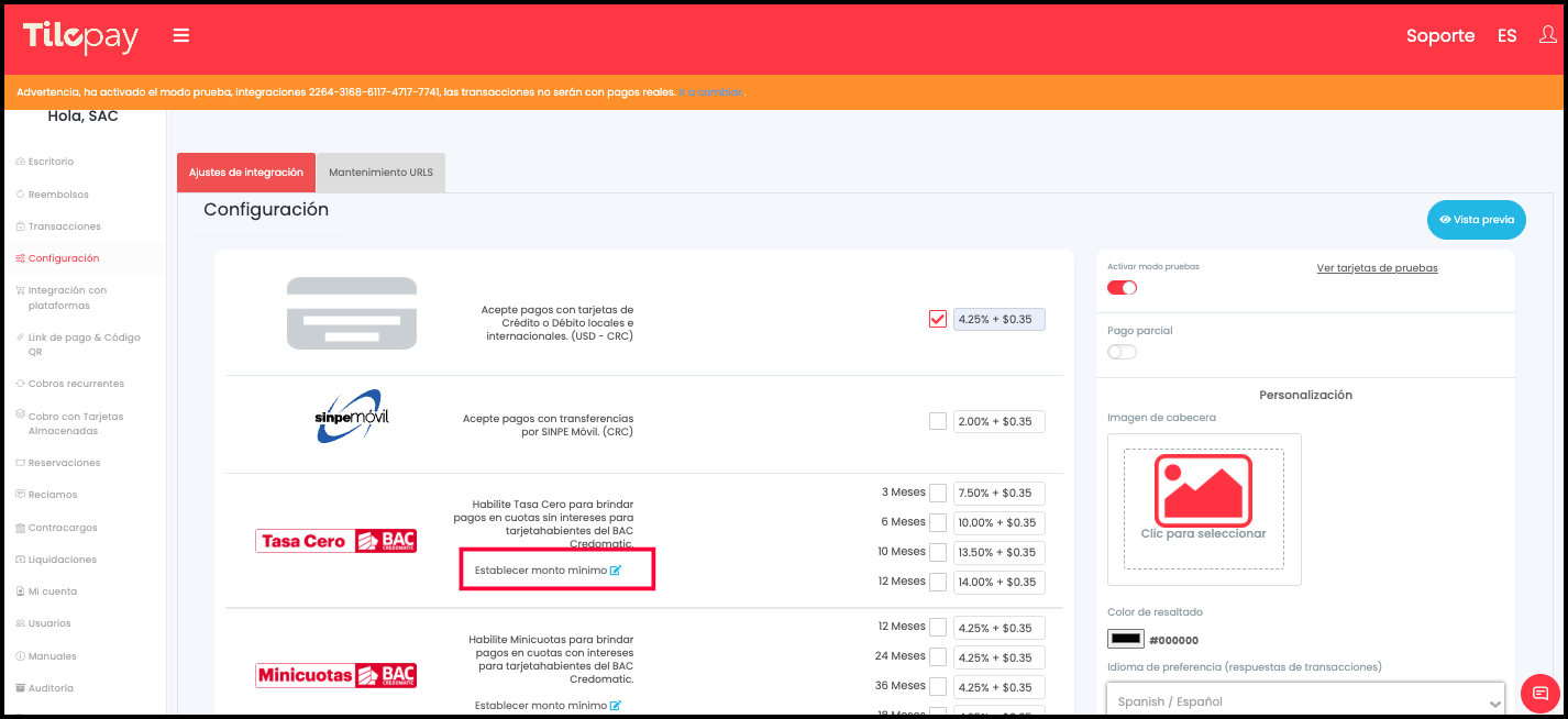 Este paso es fundamental, ya que, en caso de no establecer un monto mínimo, el método de pago no se activará correctamente.