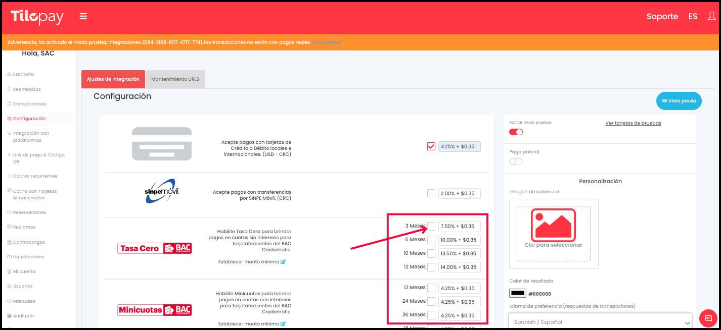 Dentro de la sección de configuración, active la casilla correspondiente a las cuotas que desea habilitar en el método de pago.