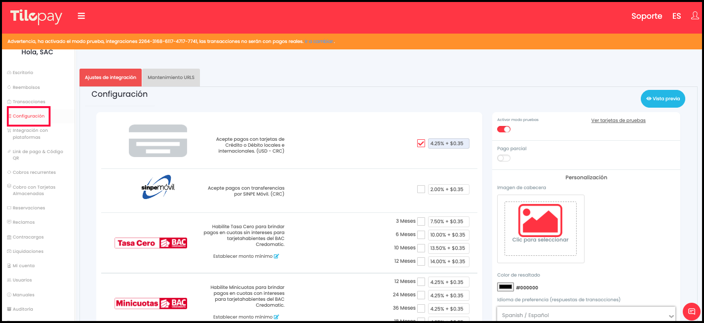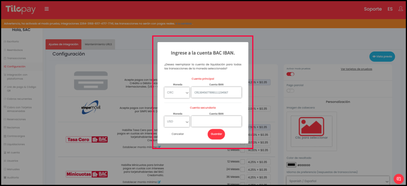 Si el comercio es de Costa Rica, el sistema exigirá que ingrese una cuenta válida del BAC, la misma que tiene asignada para recibir las liquidaciones de Tilopay.